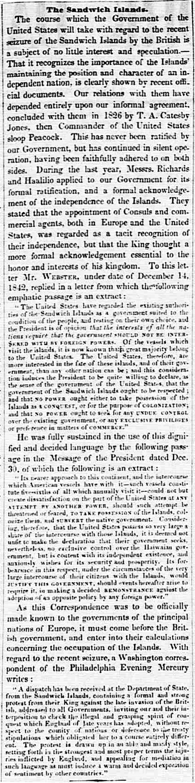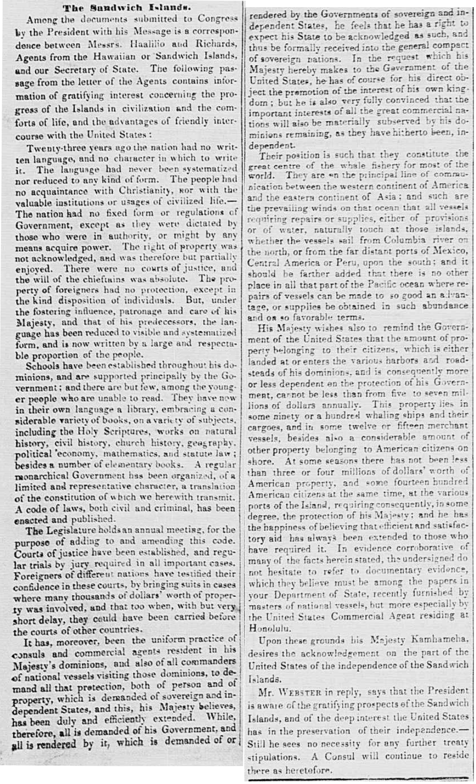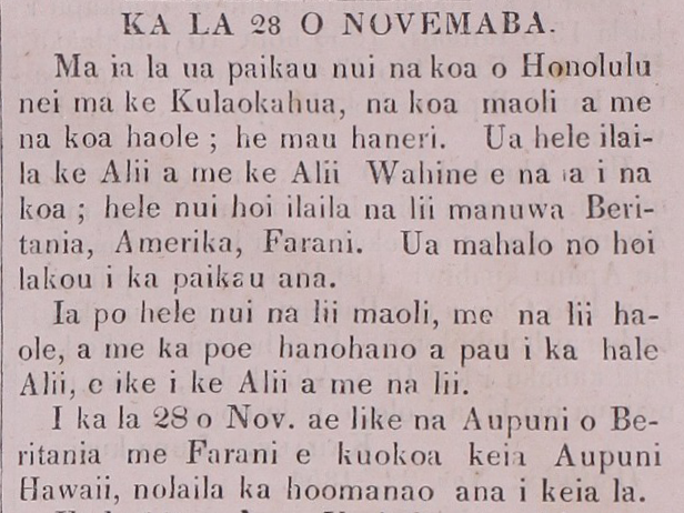 On the 28th of November, 1843, the nations of Britain and France recognized the independence of this nation of Hawaii; therefore, the 28th of November every year is a day of joy, a day of rest from work, of feasting, of fellowship.