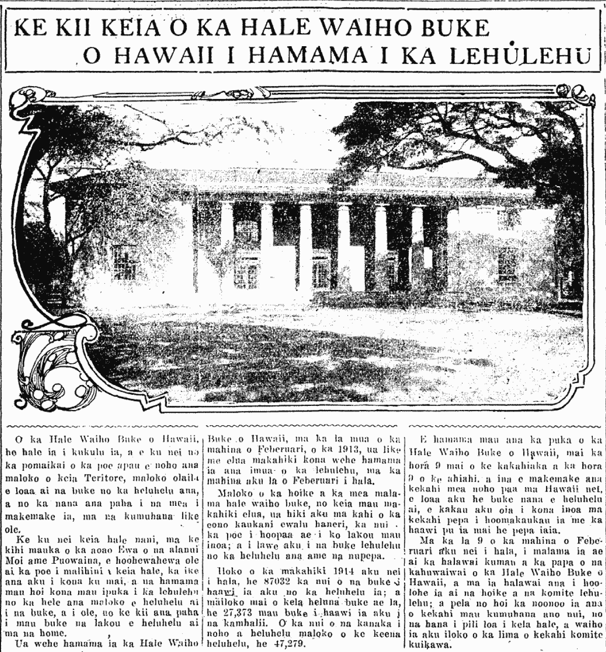 The Library of Hawaii was opened on the first day of February, 1913; it has been two years that it has been open to the public, this past February.