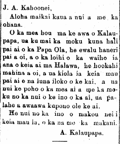 The news from the port of Kalaupapa is that the rations-bearing schooner of the Board of Health arrived; there was eight-hundred pa‘i ‘ai or more which were left at Halawa for a whole month or more and then dumped into the ocean by the luna; a lot was wasted, being thrown into the sea [a me ka moku?] because of the great spoilage—it was rotten and too sour to eat.