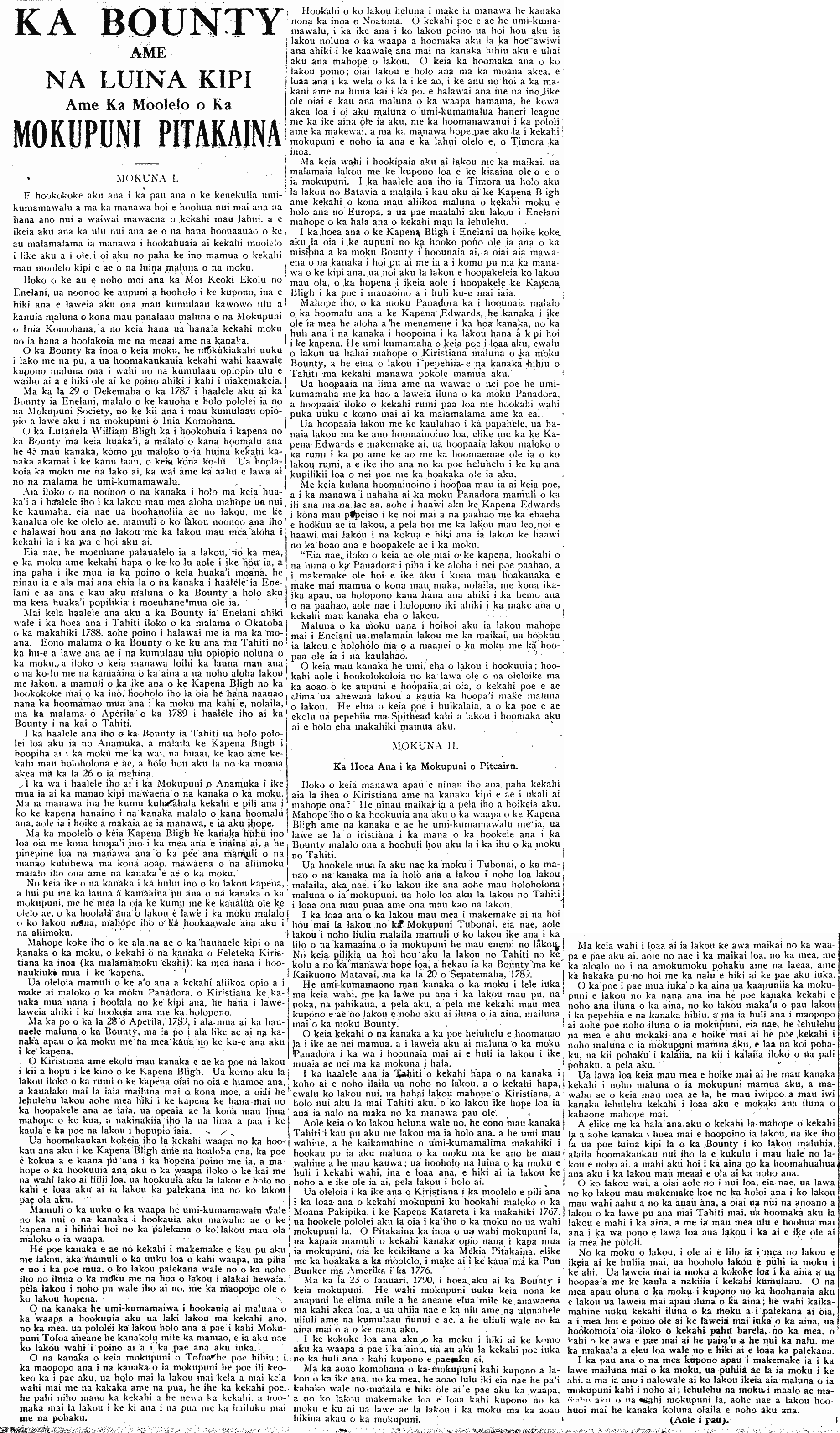 Posted in Moolelo, Serial, Translation | Tagged “Mutiny of the Bounty and Story of Pitcairn Island 1790-1894″, Bounty (ship), KA BOUNTY AME NA LUINA KIPI Ame Ka Moolelo o Ka MOKUPUNI PITAKAINA, Mutiny on the Bounty, Pitakaina, Pitcairn Island | 2 Replies