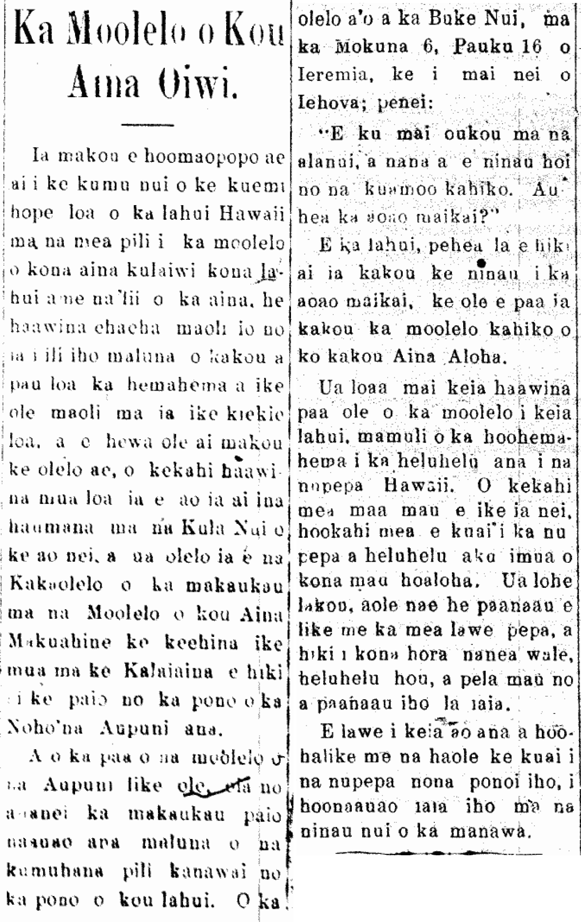 This lack of knowledge of the history of this people comes from not consistently reading the Hawaiian newspapers. Something frequently seen is one person buying a paper and reading it before his friends. They hear it but they don’t retain it like one who subscribes to the paper, who can re-read it at his leisure and thus commit to memory the information.