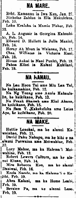Hiram Aukai to Nani Puulei, Feb. 19.