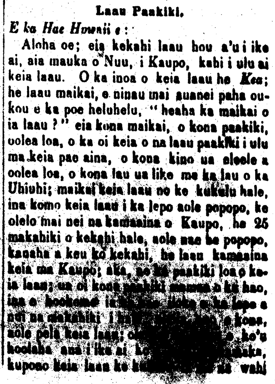 I end here; my aloha to the type setting boys of the Kuokoa. Me, in the shade of the hoi [ho’i?] leaves.