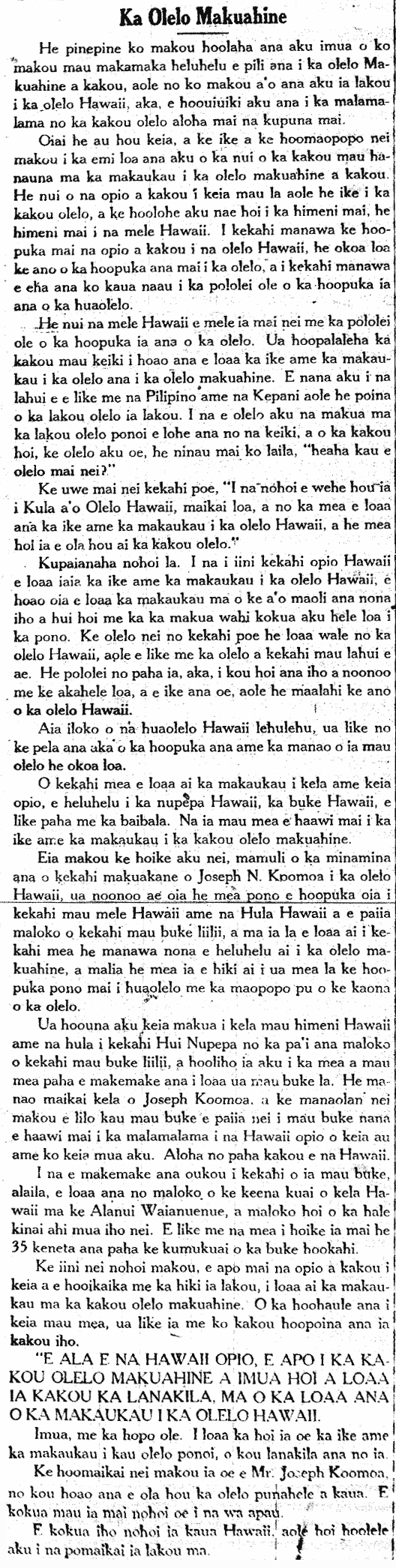 We frequently speak to our dear readers about our Mother tongue, not about our teaching them the Hawaiian language, but that the light of our beloved language from our forefathers is being extinguished.