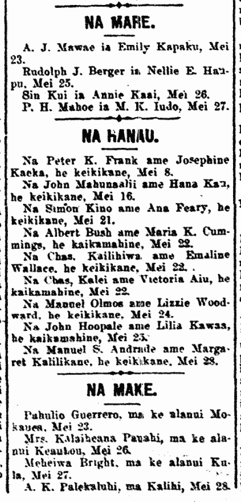To Manuel S. Andrade and Margaret Kalilikane, a son, May 28.