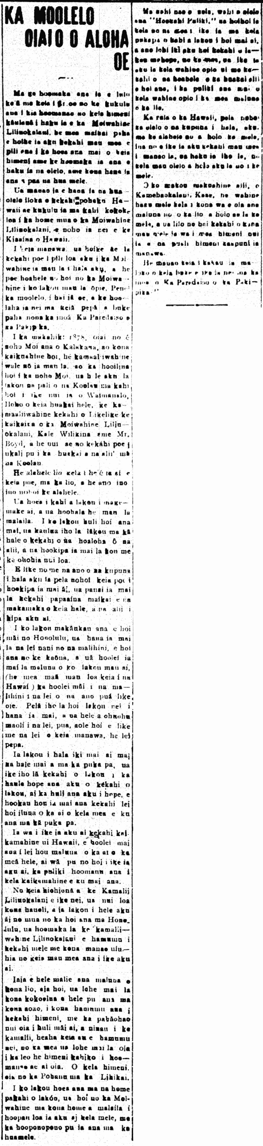 The Queen sat upon her cotton chair on which was draped a feather cloak [ahuula], and Princess Kawananakoa and Princess Kalanianaole stood behind her. The ones who did the welcoming were Prince Lilikalani and J. H. Hakuole, and the one who did introductions was Aimoku. It is believed that there were several hundreds that came to visit. And the band played for over three hours for this joyous day, the Birthday of the Queen. And in the afternoon at 3 o’clock, there was a great luau outside of Kealohilani Home, and there sat a large group who ate and gave thanks to the almighty, so that the Queen could live longer, reaching a hundred. Present indeed was the steward, Colonel Iaukea, and it was he that graciously welcomed the party guests along with Kaipo. The audience and the party that day went well. And we also pray that Liliu’s life may be increased more days; God save the Queen.