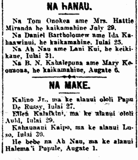 To B. N. Kahalepuna and Mary Keonaona, a daughter, August 6.