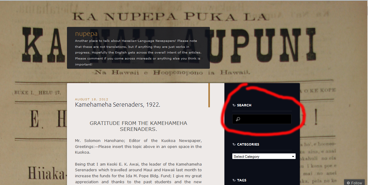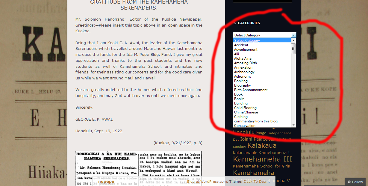 http://www.nupepa-hawaii.com is the easiest way to look through the categories of all the previously uploaded articles.