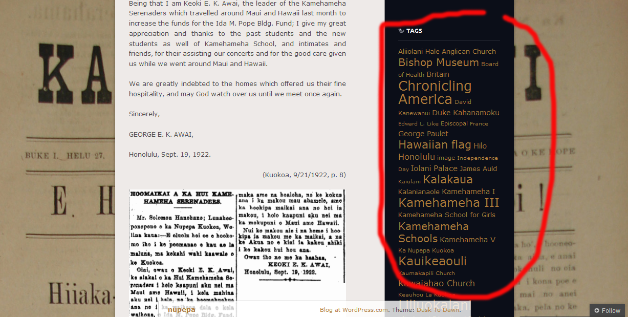 Most of the Comments seem to come from me, but once in a while there are great responses from people moved to comment, like this one from Ka’iulani Milham on Queen Liliuokalani’s jewelry being auctioned off to help orphans: https://nupepa-hawaii.com/2012/08/12/liliuokalanis-personal-adornments-sold-1924/#comment-1188