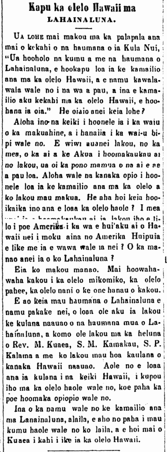 These students of Lahainaluna who speak English [namu pakake] will not attain the high education of the early students of Lahainaluna, and they will not join the ranks of Rev. M. Kuaea, S. M. Kamakau, S. P. Kalama, and their fellow famed educated Hawaiians. This level will not be reached by the Hawaiian youth who attempt to speak only English, except perhaps for those who start young.