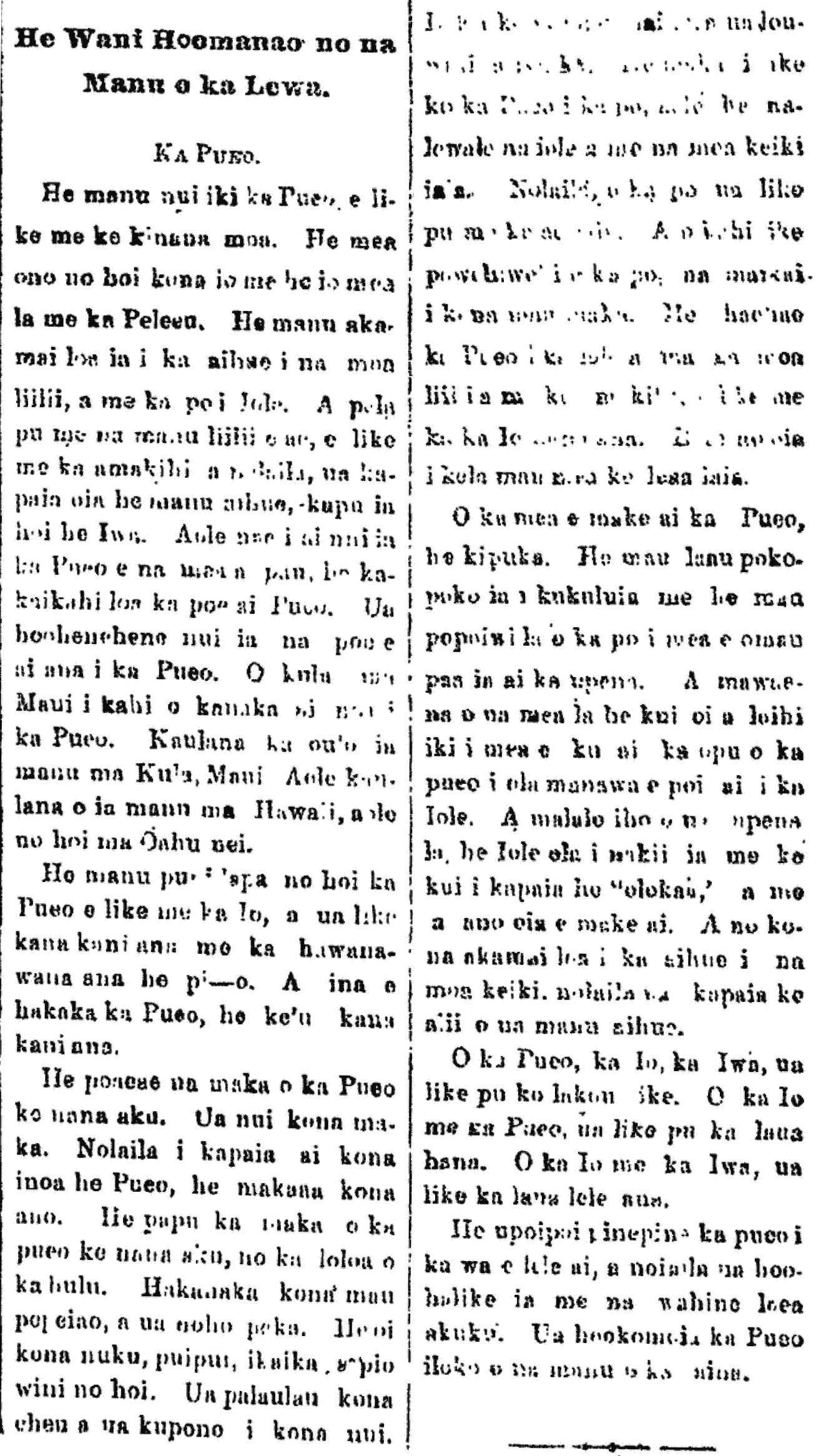 How sad for children to be denied their mother’s milk, and fed only cow’s milk. They will end up malnourished, for the nourishment God prepared for them is better than all other foods. How tragic is it for the youth to be denied speaking the language of their parents. What is this big push to acquire the English language [olelo haole]? Is it to prepare them to become Americans when Hawaii joins as a state of the United States as is being rumored about? Is that the idea at Lahainaluna?