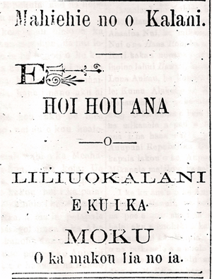 Anticipation, 1899. Posted on October 17, 2012 by nupepa Grand is the Royal One RETURNING IS LILIUOKALANI TO RULE THE LAND This is our hope. [This is a running announcement in the Loea Kalaiaina.] (Loea Kalaiaina, 12/16/1899, p. 2) Ka Loea Kalaiaina, Buke III, Helu 49, Aoao 2. Dekemaba 16, 1899. Share this: Click to share on X (Opens in new window) X Click to share on Facebook (Opens in new window) Facebook Click to email a link to a friend (Opens in new window) Email Click to print (Opens in new window) Print Like Loading... Related