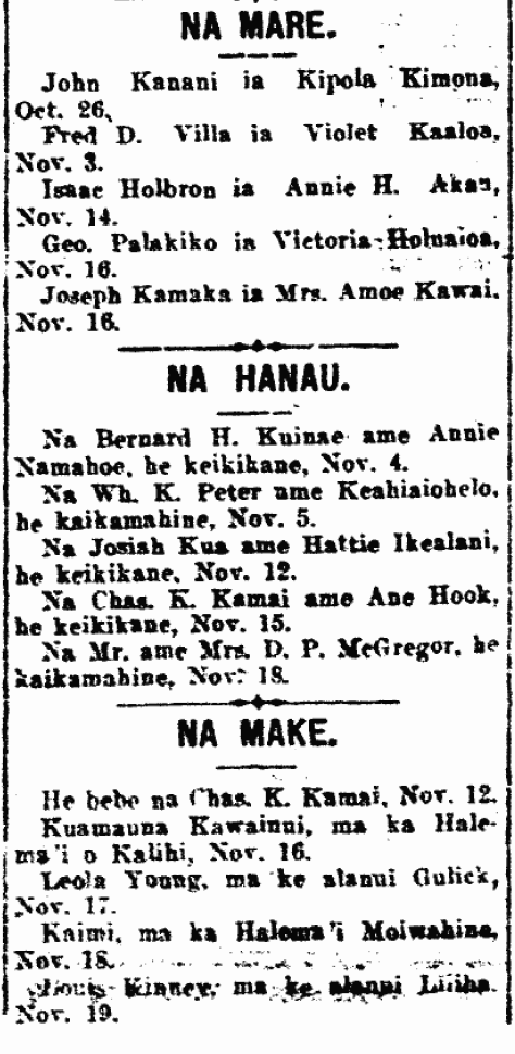 Kuokoa_11_22_1912_8 Published December 1, 2012 at 474 × 970 in Vital Statistics, 1912. Ka Nupepa Kuokoa, Buke XLVIII, Helu 47, Aoao 8. Novemaba 22, 1912.