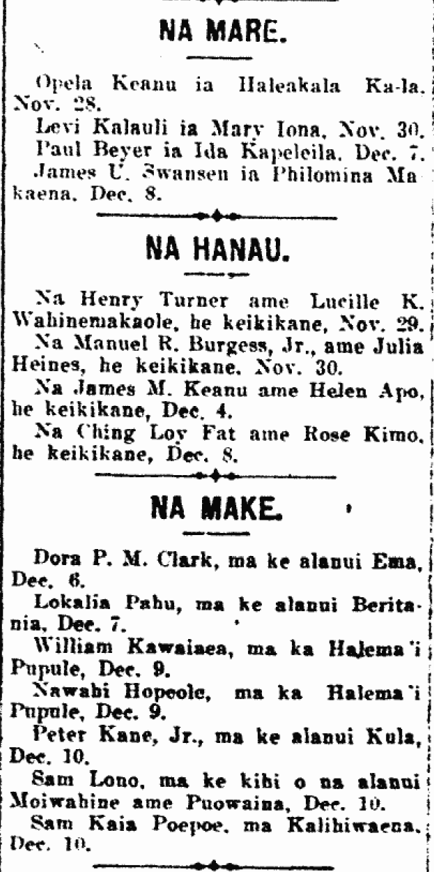 Kuokoa_12_13_1912_8 Published December 15, 2012 at 623 × 1250 in Vital Statistics, 1912. Ka Nupepa Kuokoa, Buke XLVIII, Helu 50, Aoao 8. Dekemaba 13, 1912.