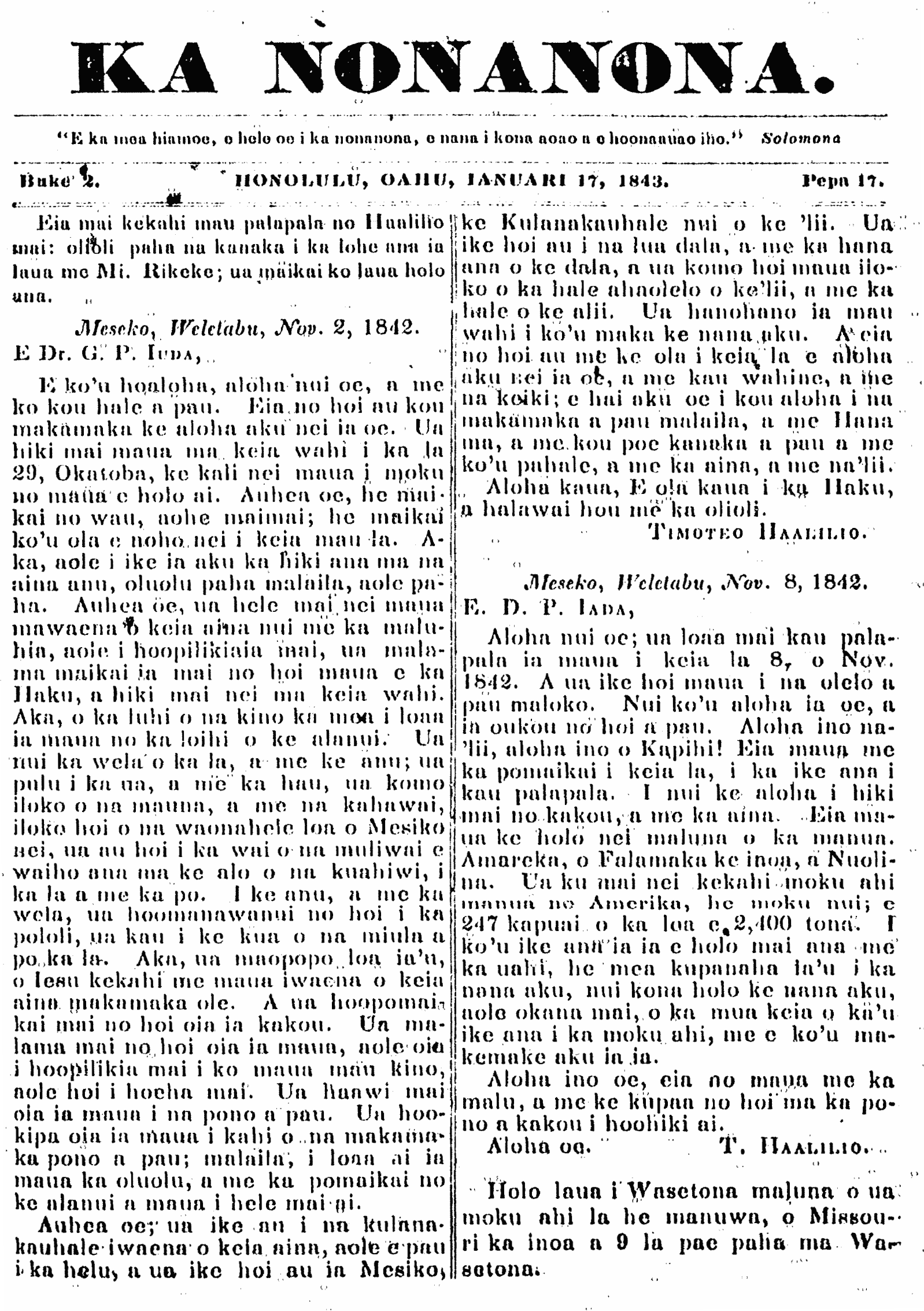 Nonanona_1_17_1843_81 Published December 21, 2012 at 1598 × 2267 in More on Hawaiian Independence Day and Aloha Aina, 1843. Ka Nonanona, Buke 2, Pepa 17, Aoao 81. Ianuari 17, 1843.