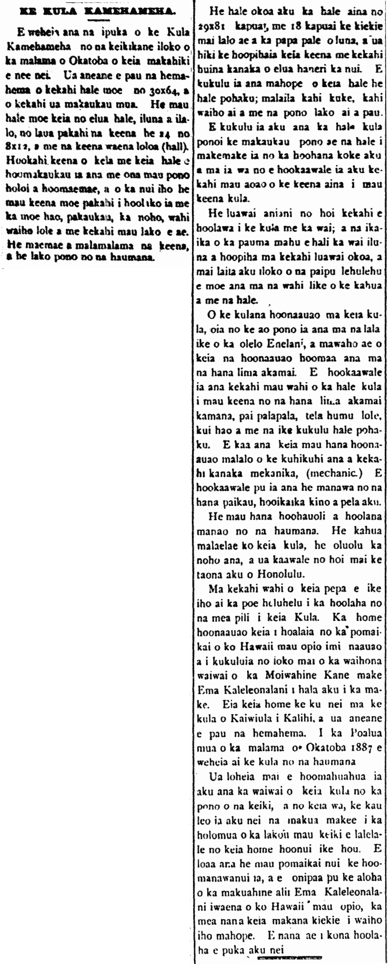 Kuokoa_5_28_1887_2 Published January 3, 2013 at 1251 × 3111 in E o, e Kaleleonalani! Queen Emma and Kamehameha Schools, 1887. Ka Nupepa Kuokoa, Buke XXVI, Helu 22, Aoao 2. Mei 28, 1887.