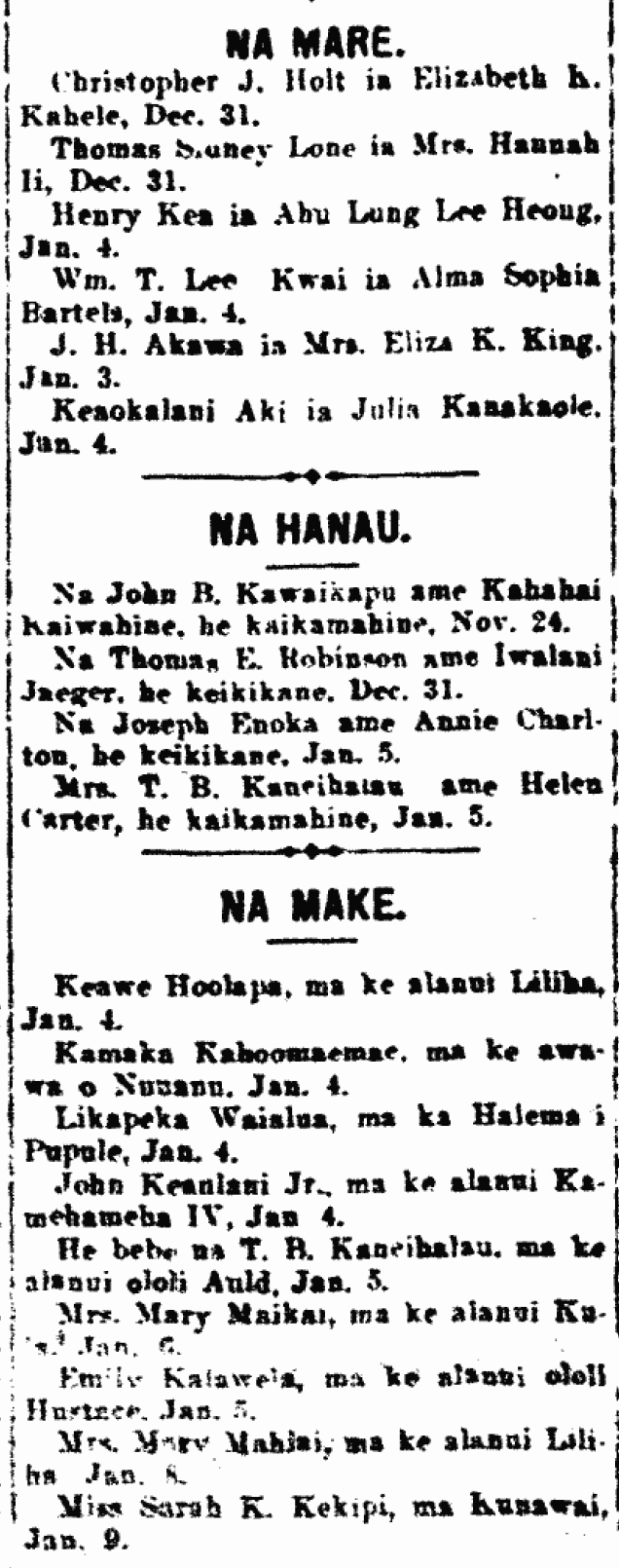 Mrs. Mary Mahiai, on Liliha Street, Jan. 8.