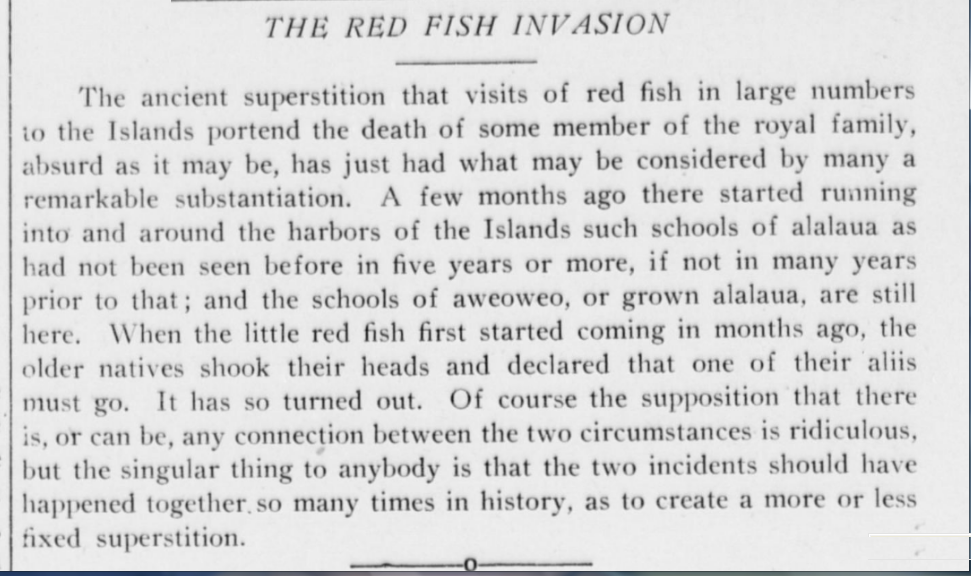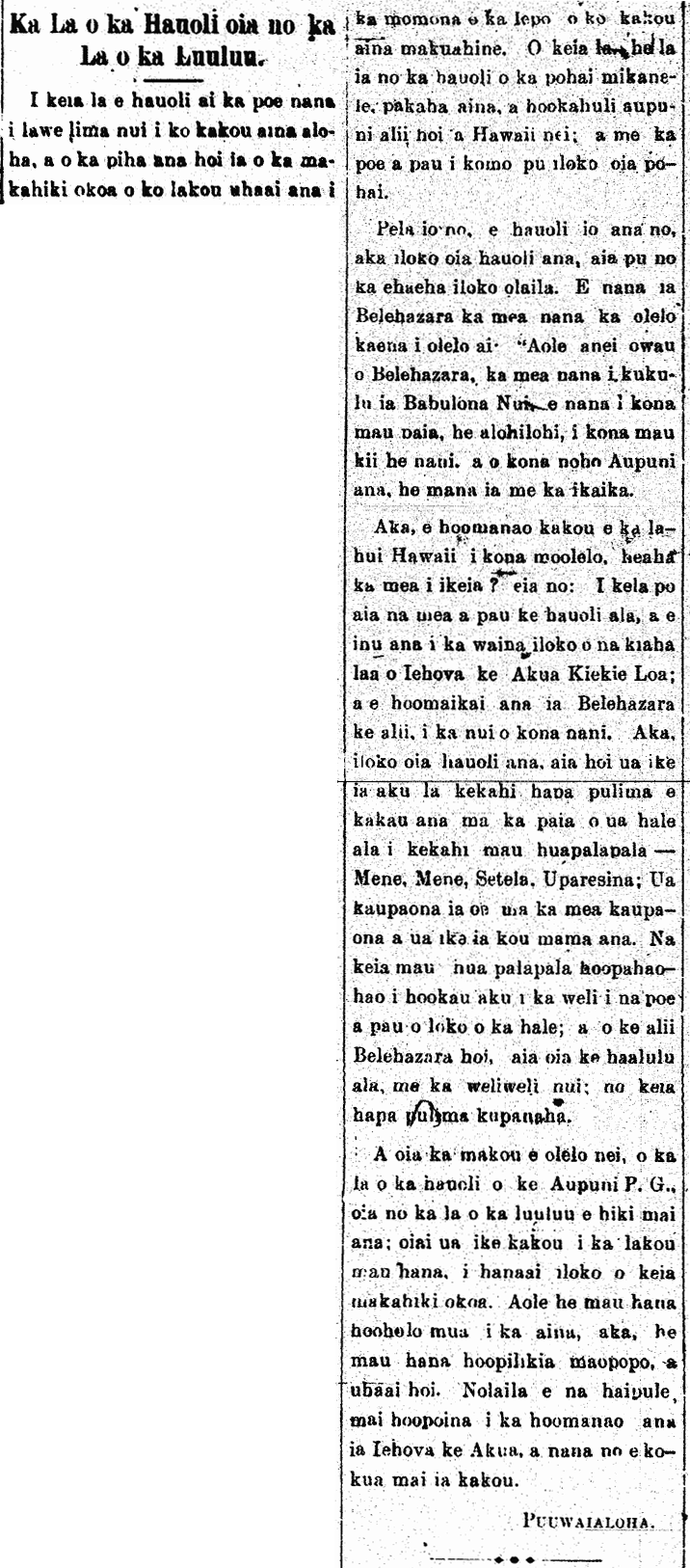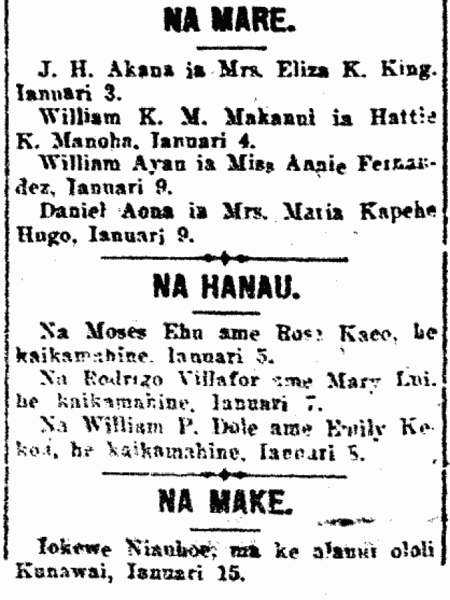 The Kuokoa, on this first issue of its proud days of 1874, wants to gift this Genealogical List of the Rulers over the Hawaian people, starting from Kahiko Luamea, from the pen of S. M. Kamakau. It was upon Oahu that the ancient ones first lived, and the genealogy from before this is not from here in Hawaii, but it is said that they were from the sky [lewa]. The first people in this genealogy, it is widely stated that they are from the Islands of the South Pacific, New Zealand, and the islands to the Western North Pacific. And the listing of Alii Genealogy below just pertains to those who were Aliiaimoku. From Kahiko Luamea to Kapawa, they just ruled on Oahu. From Kapawa to Palena, most of the Alii were on Oahu and Maui; one was from Kauai, Luanuu; and two on Hawaii, Wahieloa and Pohukaina; and from Palena is where Hawaii’s royal Ancestry from Maui come from. And from Palena was born Hana, thereafter Maui’s and Hawaii’s chiefly line have been born until this time. It began from Abraham, being that the laws were the same, the genealogy was the same, and the circumcision was the same. Here are the alii listed out: