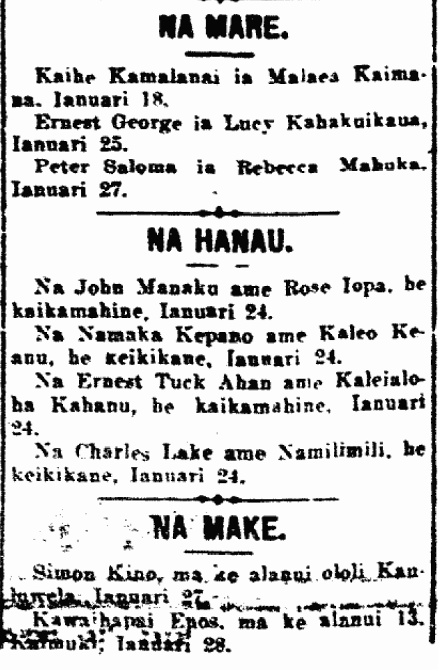 To Charles Lake and Namilimili, a son, January 24.