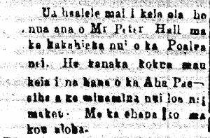 Mr. Peter Hall left this life in the early morning this Tuesday. He was a constant help to the Aha Paeaina [Island-Wide Convention of Churches], and we bemoan his passing. Our aloha goes out to his family.