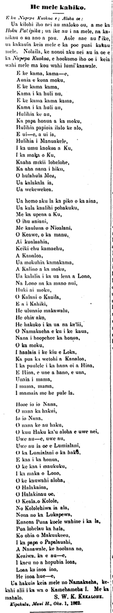 I just took a look within you, as well as the Hoku [o ka] Pakipika; and I saw mele, and kanikau of all sorts. I however did not see this mele printed by the people who fancy publishing mele. Therefore, I ask you, Nupepa Kuokoa, to include this little mele in some available space.