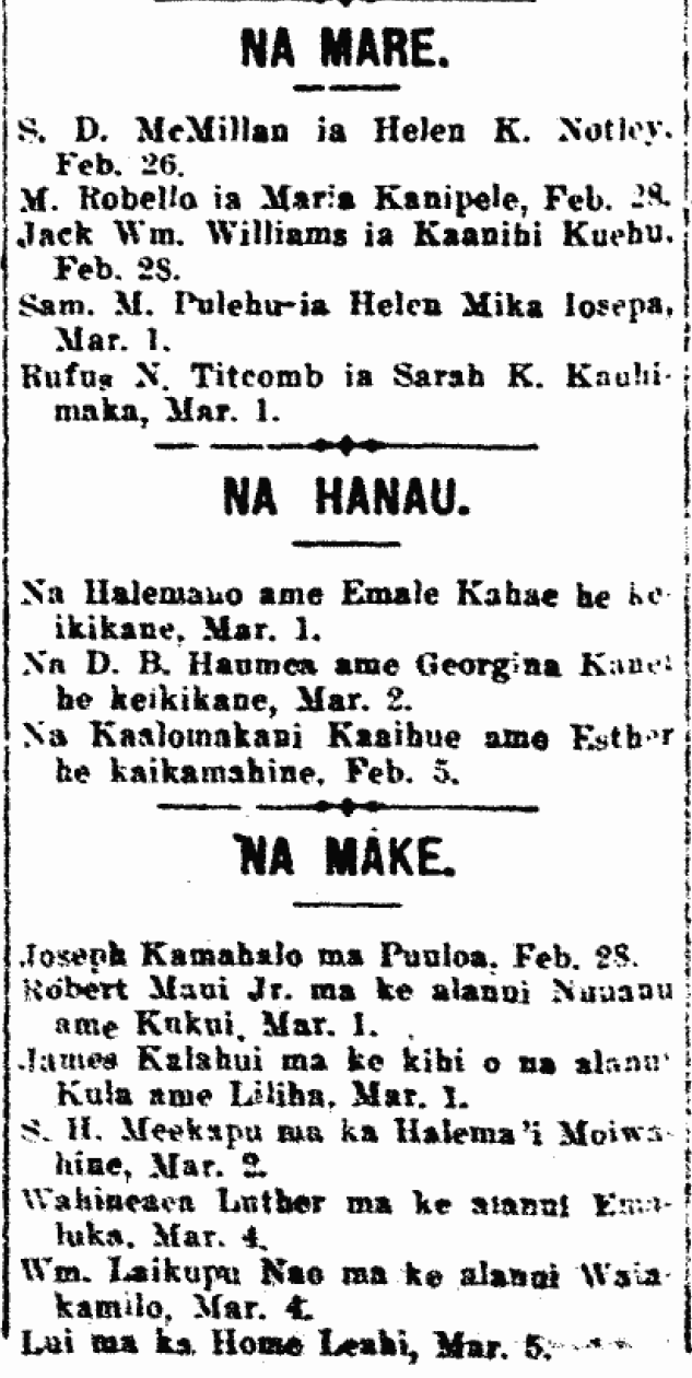 To Inoaole [Nameless] and Louisa Abins, a son, Feb. 24.