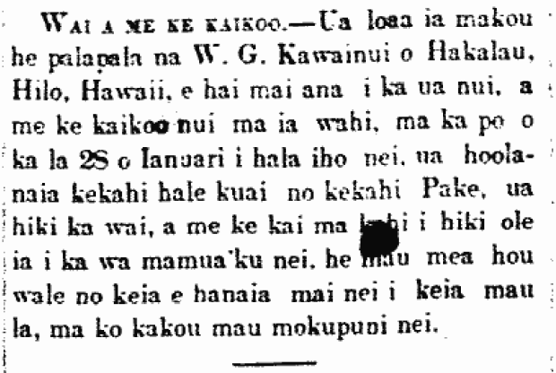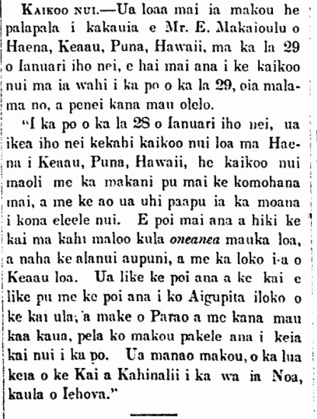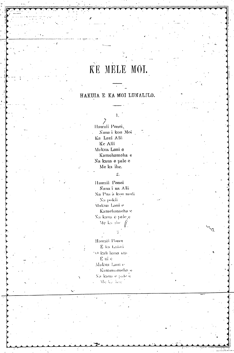 William Charles Lunalilo, whose death we briefly announced in our last issue, was descended from the highest of the Royal line of Hawaiian Chiefs. His mother was Kekauluohi, known as Kaahumanu III., Kuhina Nui (Premier) under Kamehameha III., and was married to Charles Kanaina, from which marriage two sons were born Davida and William. The former died when quite young. William, soon after his mother’s death, when about eight years of age, was placed in the Royal School, kept by Mr. and Mrs. Cooke, where he received a liberal English education, and as he possessed naturally, a quick mind, he became one of the best scholars in the school. For English classical literature he had great fondness, and his familiarity with the English poets was remarkable. It was this taste that led him to indulge in writing poetry, some of which was well composed. On one occasion, twelve years ago, he called on us in our editorial sanctum and sat down at our table. In the course of the conversation, we suggested that he become a competitor for the best prize which had been offered for the best Hawaiian version of “God Save the King.” He took a pen and in fifteen or twenty minutes handed us his verses, which we enclosed in an envelope and passed with ten or twelve others to the judges, who awarded it the prize, and this is known now as the Hawaiian National Hymn “God Save the King.” We instance this to illustrate the extraordinary mental qualities with which he was endowed.—Gazette, Feb. 11.