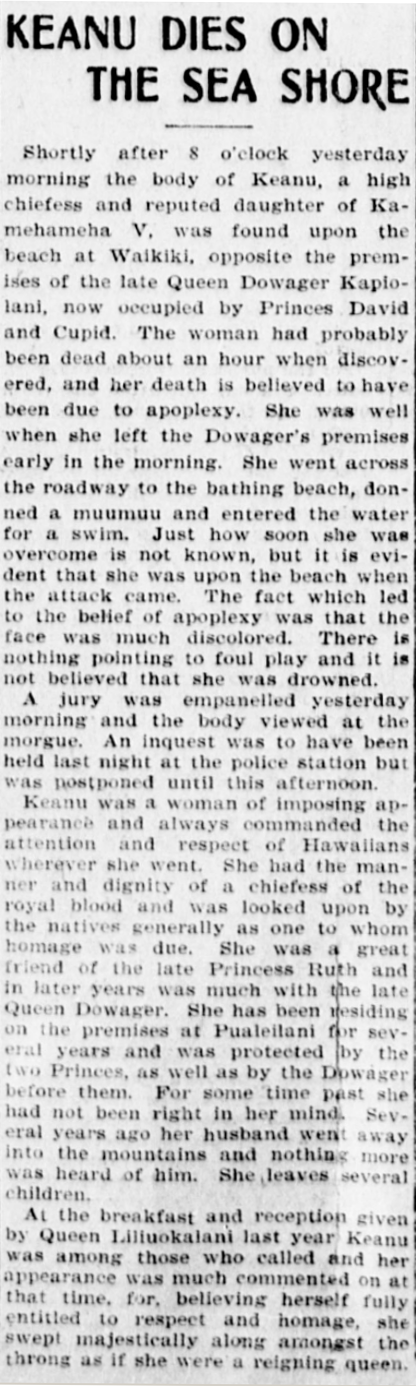 Shortly after 8 o’clock yesterday morning the body of Keanu, a high chiefess and reputed daughter of Kamehameha V, was found upon the beach at Waikiki, opposite the premises of the late Queen Dowager Kapiolani, now occupied by Princes David and Cupid. The woman had probably been dead about an hour when discovered, and her death is believed to have been due to apoplexy. She was well when she left the Dowager’s premises early in the morning. She wen across the roadway to the bathing beach, donned a muumuu and entered the water for a swim. Just how soon she was overcome is not known, but it is evident that she was upon the beach when the attack came. The fact which led to the belief of apoplexy was that the face was much discolored. There is nothing pointing to foul play and it is not believed that she was drowned.