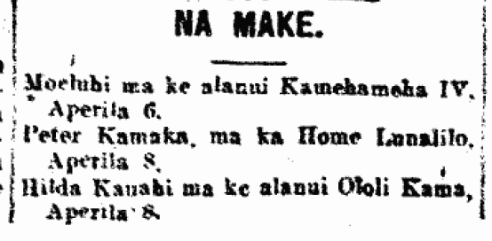 Keanu was a woman of imposing appearance and always commanded the attention and respect of Hawaiians wherever she went. She had the manner and dignity of a chiefess of the royal blood and was looked upon by the natives generally as one to whom homage was due. She was a great friend of the late Princess Ruth and in later years was much with the late Queen Dowager. She has been residing on the premises at Pualeilani for several years and was protected by the two Princes, as well as by the Dowager before them. For some time past she had not been right in her mind. Several years ago her husband went away into the mountains and nothing more was heard of him. She leaves several children.