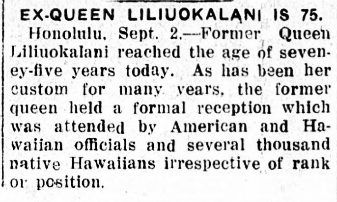 Honolulu, Sept. 2.—Former Queen Liliuokalani reached the age of seveney-five years today. As has been her custom for many years, the former queen held a formal reception which was attended by American and Hawaiian officials and several thousand native Hawaiians irrespective of rank or position.