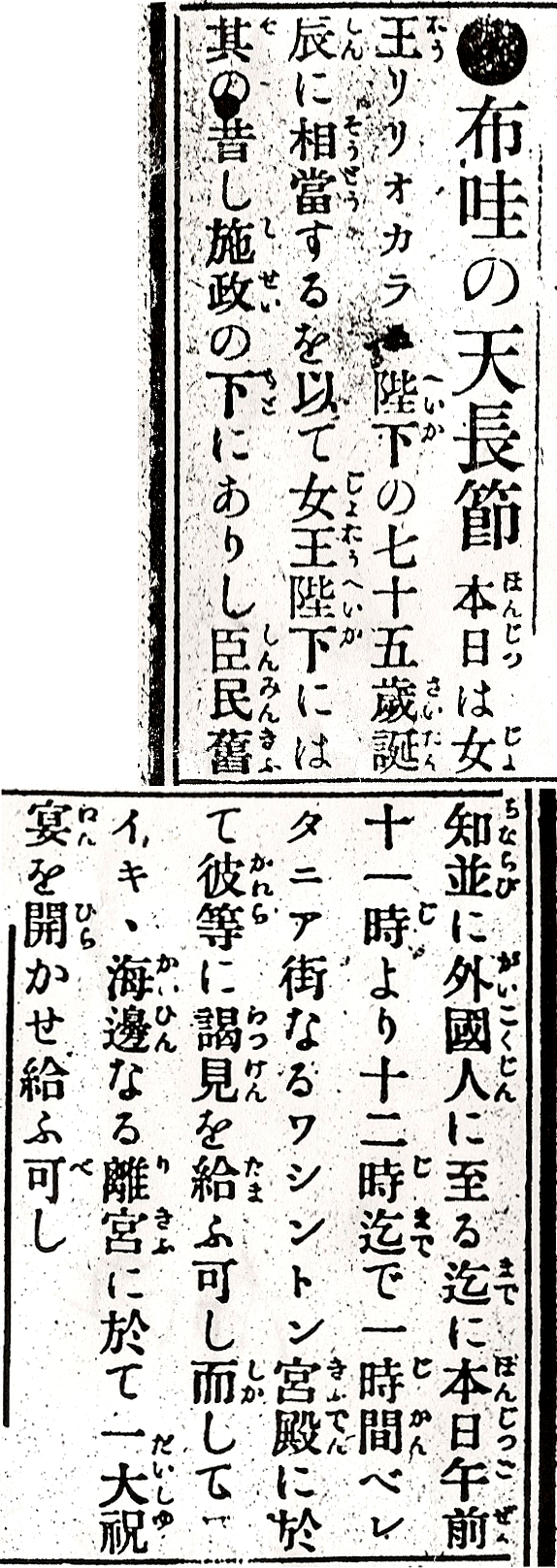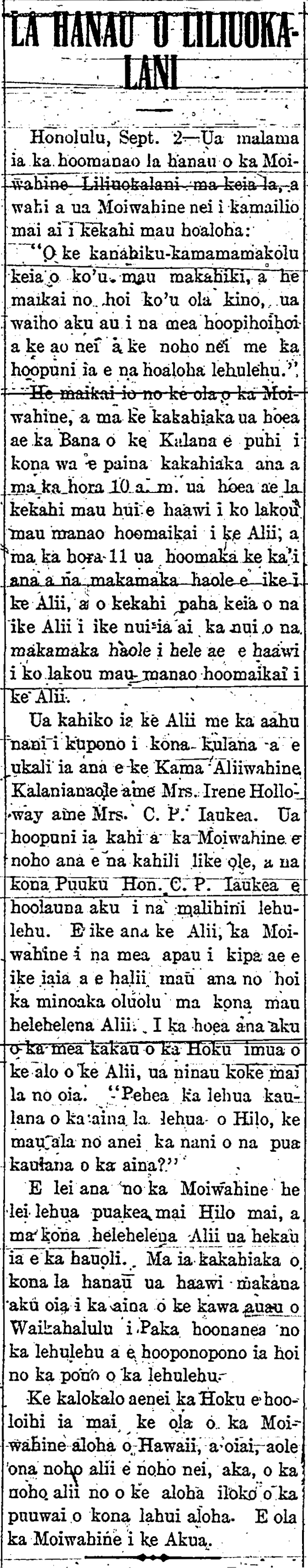In accordance with this day being Queen Liliuokalani’s 75th birthday, her loyal subjects and old friends under her former administration, and even those of foreign birth, on this day from 11 o’clock in the morning to 12 o’clock, for 1 hour at Washington Palace on Beretania Street, they will be given audience; and at the imperial villa on the seaside of Wakiki will be held a grand celebration.