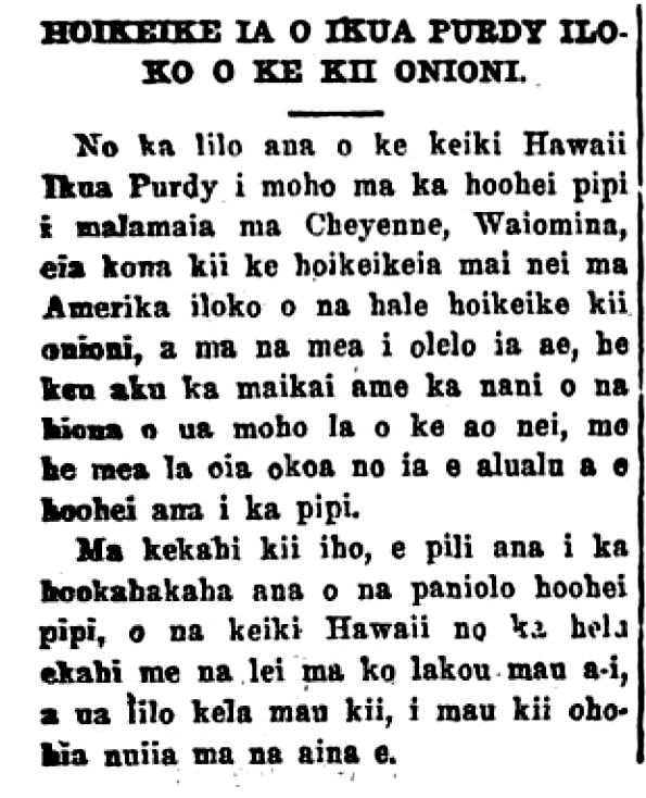 The Hawaiian boys took 1st, 3rd, and 6th places in the great contest of Wyoming; this is news which all Hawaiian hearts can be happy about, for the honor garnered by our boys. Many expert ropers showed up, from the forests of the north, the champion of the wire lasso of the rugged plains of Alaska, the experts from the furrowed lands of the far south, the champion rider of the Pampas, the lightning-handed champion of Texas, and so many more; however, all of their knowledge and preparation was overcome by Ikua Purdy. Not one of them was his match, with his swift and skilled lassoing and felling of the steer in short time. 56 seconds was not the fastest time made by Ikua Purdy like the 38 3/4 seconds he achieved at Kapiolani Park some years earlier, however, it should be kept in mind that the conditions there are not the same as ours. McPhee is the one with the fastest time, 37 2/5 seconds gotten at a big contest held in Cheyenne, Wyoming, but from that time to now, he did not make that time again; he was constantly defeated by the Hawaiian boys in contests after that.