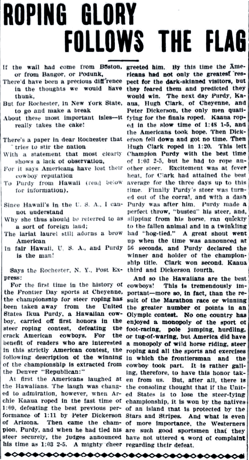 At first the Americans laughed at the Hawaiians. The laugh was changed to admiration, however, when Archie Kaaua roped in the fast time of 1:09, defeating the best previous performance of 1:11 by Peter Dickerson of Arizona. Then came the champion, Purdy, and when he had tied his steer securely, the judges announced his time as 1:03 2-5. A mighty cheer greeted him. By this time the Americans had not only the greates respect for the dark-skinned visitors, but they feared them and predicted they would win. The next day Purdy, Kaaua, Hugh Clark, of Cheyenne, and Peter Dickerson, the only men qualifying for the finals roped. Kaaua roped in the slow time of 1:48 1-5, and the Americans took hope. Then Dickerson fell down and got no time. Then Hugh Clark roped in 1:20. This left Champion Purdy with the best time of 1:03 2-5, but he had to rope another steer. Excitement was at fever heat, for Clark had attained the best average for the three days up to this time. Finally Purdy’s steer was turned out of the corral, and with a dash Purdy was after him. Purdy made a perfect throw, “busted” his steer, and, slipping from his horse, ran quickly to the fallen animal and in a twinkling had “hog-tied.” A great shout went up when the time was announced at 56 seconds, and Purdy declared the winner and holder of the championship title. Clark won second, Kaaua third and Dickerson fourth.