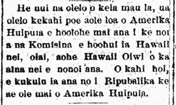 I positively know that the self-appointed four chiefs of the Provisional Government in the Hawaiian Islands and the five commissioners coming to Washington to negotiate a treaty of annexation are, without a single exception, missionariesʻ confederates. Not a single native Hawaiian is with them, therefore, they cannot be considered as the representatives of the Hawaiian nation, of which they are aliens and enemies, but only as the emissaries of one side (or of a higher), which is not the right side.