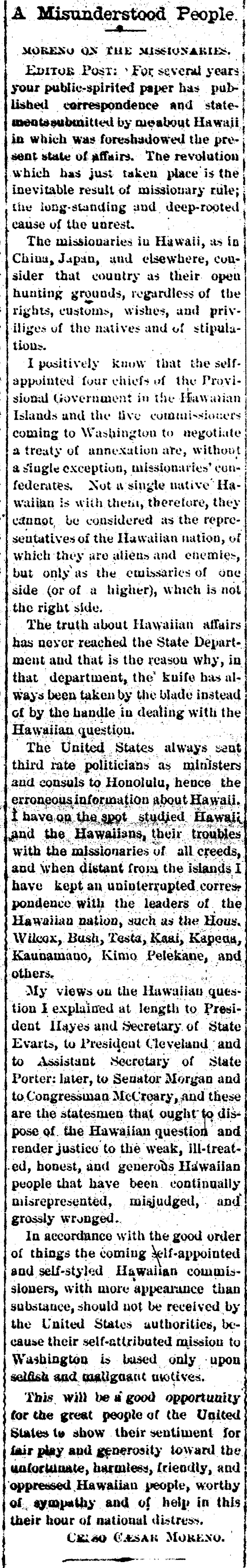 Editor Post: For several years your public-spirited paper has published correspondence and statements submitted by me about Hawaii in which was foreshadowed the present state of affairs. The revolution which has just taken place is the inevitable result of missionary rule; the long-standing and deep-rooted cause of the unrest.
