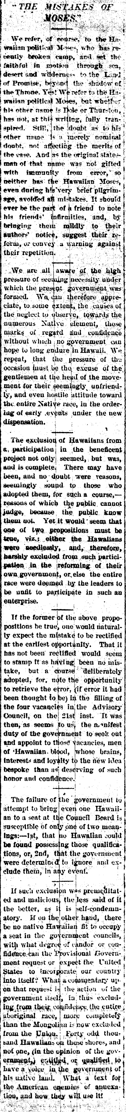 We refer, of course, to the Hawaiian political Moses, who has recently broken camp, and set the faithful in motion through sea, desert and wilderness to the Land of Promise, beyond the shadow of the Throne. Yes! We refer to the Hawaiian political Moses, but whether his other name is Dole or Thurston, has not, at this writing, fully transpired. Still, the doubt as to his other name is a merely nominal doubt, not affecting the merits of the case. And as the original state—man of that name was not gifted with immunity from error, so neither has the Hawaiian Moses, even during his very brief pilgrimage, avoided all mistakes. It should ever be the part of a friend to note his friends’ infirmities, and, by bringing them mildly to their authors’ notice, suggest their reform, or convey a warning against their repetition.
