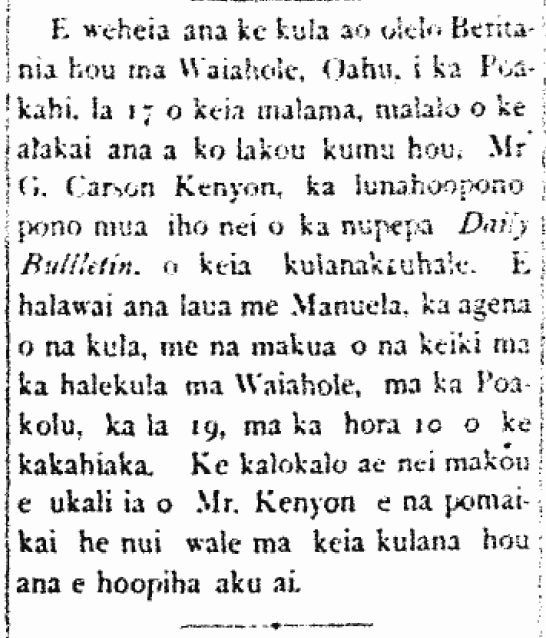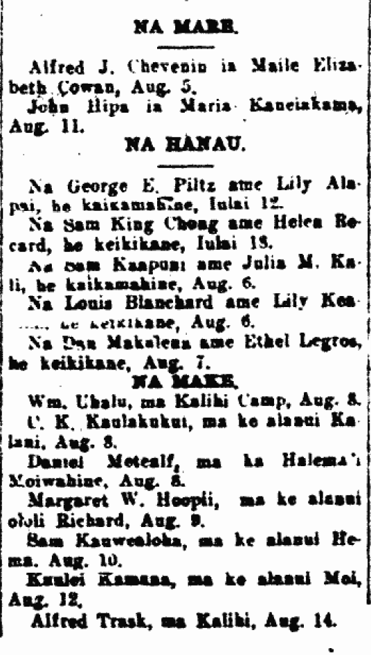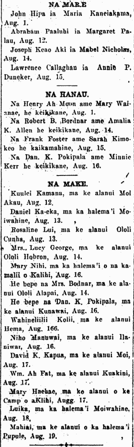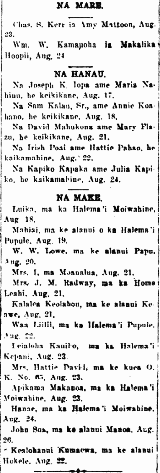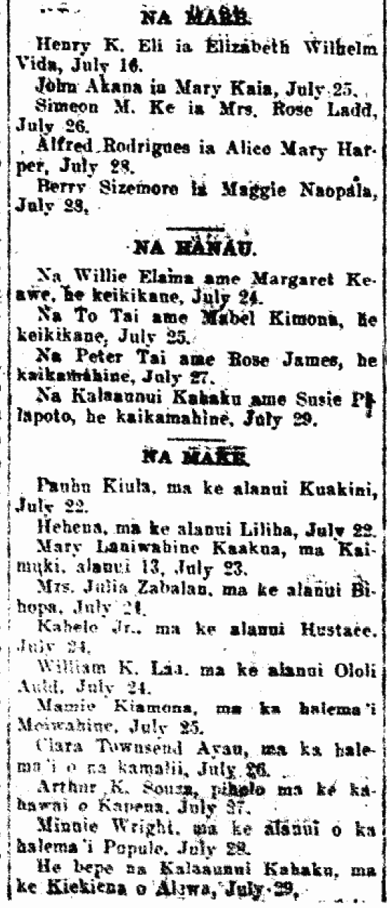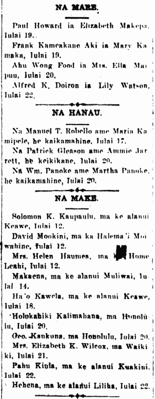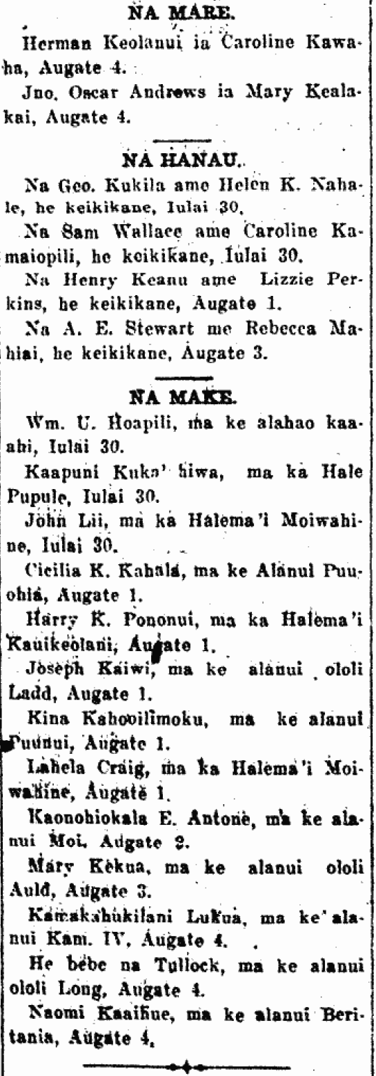 With his death, he left behind three of his old friends still living: Frank Mahuka, living with his children, grandchildren and many of his family in Kalihi Camp; James Pohina, and the one writing this [Samuel K. Kamakea], still with the band today. All of the old ones of this profession in 1870 have died, and we are the old members left alive today. But we are to follow too on the same path, so who amongst us three will be the one to go after Jack Kuamoo.