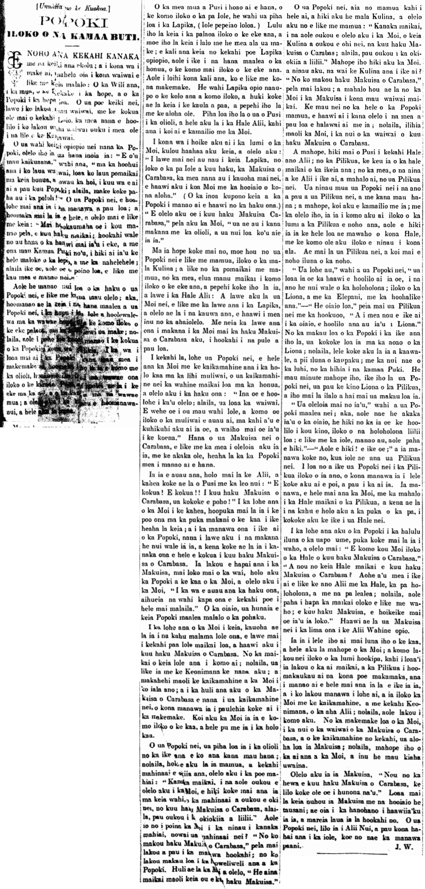 O ua wahi keiki opiopio nei nana ka Popoki, olelo iho la ua hana inoia ia: “E o’u mau kaikuaana,” wahi ana, “ma ka hoohui ana i ko laua waiwai, loaa ko laua pomaikai ma keia honua, a owau ka hoi, i kuu wa e ai ai a pau kuu Popoki; alaila, make koke paha au i ka pololi!” O ua Popoki nei, e hoolohe mai ana ia i na manawa a pau loa; a hoomaka mai la ia e hele, a olelo mai e like me keia: “Mai hookaumaha oe i kou manao pela, e kuu haku maikai; hookahi wale no au hana o ka haawi mai ia’u i eke, a me ona mau Kamaa Puki no’u, i hiki ai ia’u ke hele maloko o ka lepo, a me ka nahelehele; alaila ike oe, aole oe e poino loa, e like me kau mea e manao nei.”…