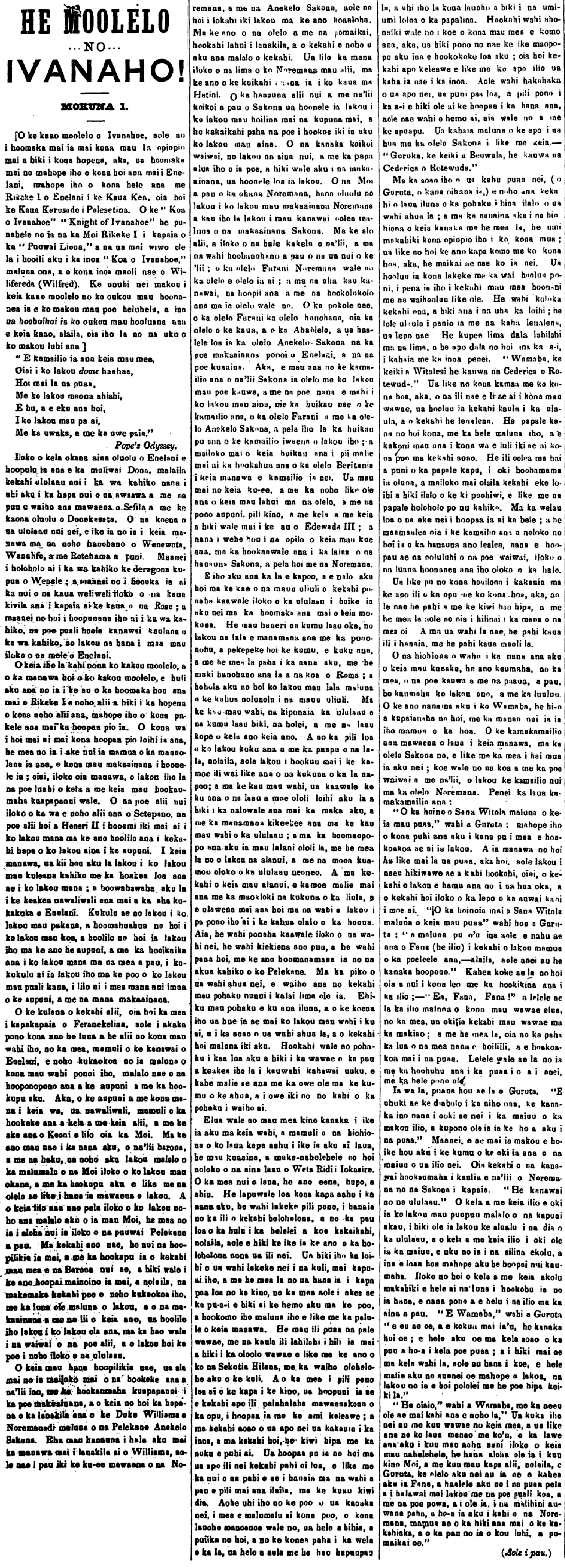 [“Ivanhoe” by Sir Walter Scott is found in Au Okoa from 2/9/1871 until 8/29/1872.  The story is almost completed. Unfortunately, the issue that the last section of the story would have appeared in (9/5/1871) is missing the last two pages! The Ivanaho translation usually appeared on the fourth page of each issue. There are many missing pages and issues and volumes of Hawaiian-Language Newspapers, hopefully someday they will be found, if not in Hawaii, then somewhere across the ocean. Hawaiians lived all over the world, and they had the papers sent to them so that they would not lose touch with the sands of their birth…]