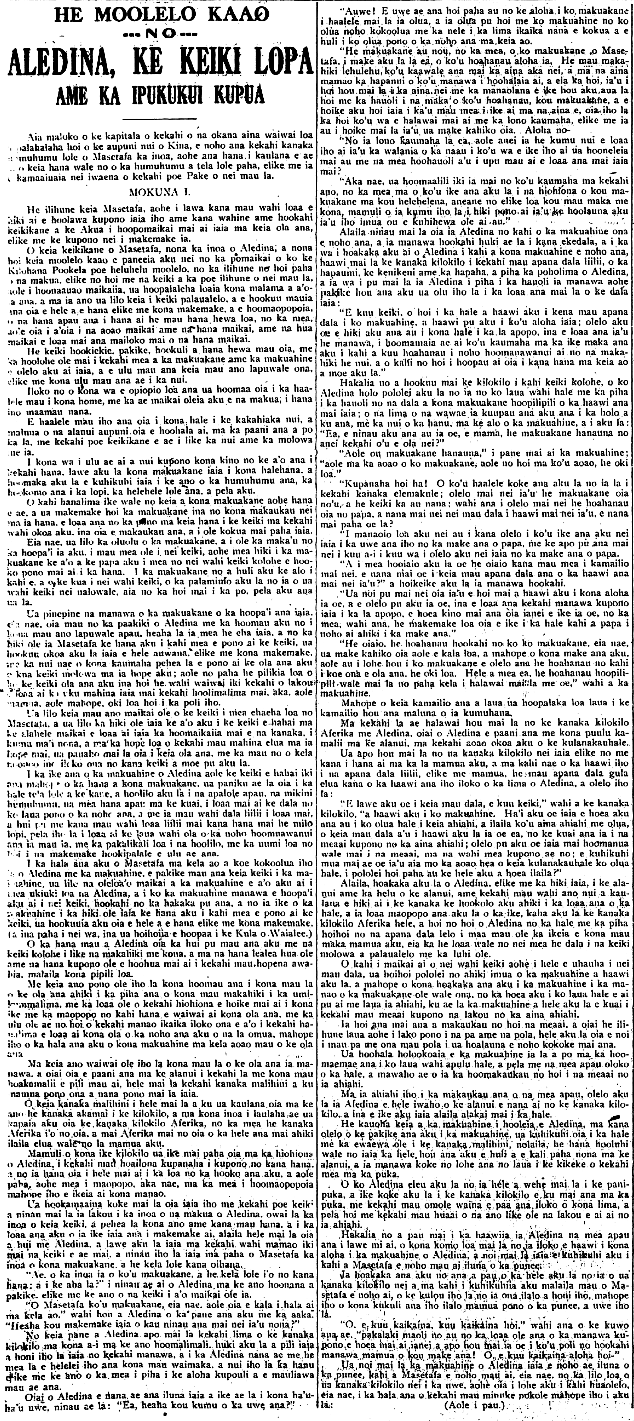 O keia keikikane o Masetafa, nona ka inoa o Aledian, a nona hoi keia moolelo kaao e paneeia aku nei no ka pomaikai o ko ke Kilohana Pookela poe heluhelu moolelo, no ka ilihune no hoi paha o na makua, elike no hoi me na keiki a ka poe ilihune o nei mau la, aole i hoonaauao maikaiia, ua hoopalaleha loaia kona malama a a’oia ana, a ma ia ano ua lilo keia i keiki palaualelo, a e hookuu mauia ana oia e hele a e hana elike me kona makemake, a e hoomaopopoia, o na hana apau ana i hana ai he mau hana hewa loa, no ka mea, aole oia i a’oia i na aoao maikai ame na hana maikai, ame na hua maikai e loaa mai ana mailoko mai o na hana maikai…