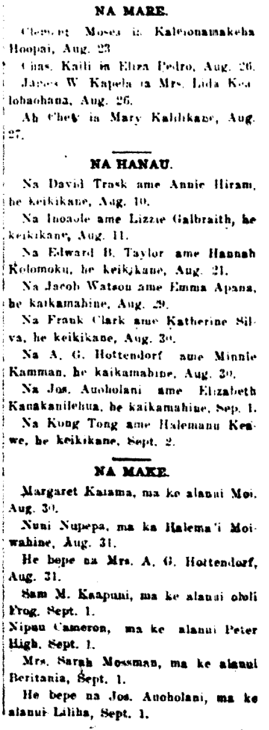 Then English-language school at Waiahole, Oahu will be opening on Monday, the 17th of this month, under the leadership of their new teacher, Mr. G. Carson Kenyon, the previous editor of the newspaper, Daily Bulletin, of this town. He will meet with Manuela, the agent of the school, along with the parents of the students, at the schoolhouse at Waiahole, on Wednesday, the 19th, at 10 o’clock in the morning. We pray that Mr. Kenyon will be accompanied by only great blessings in this new position he is filling.