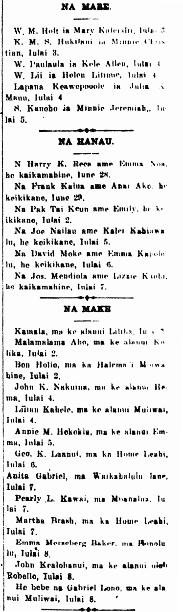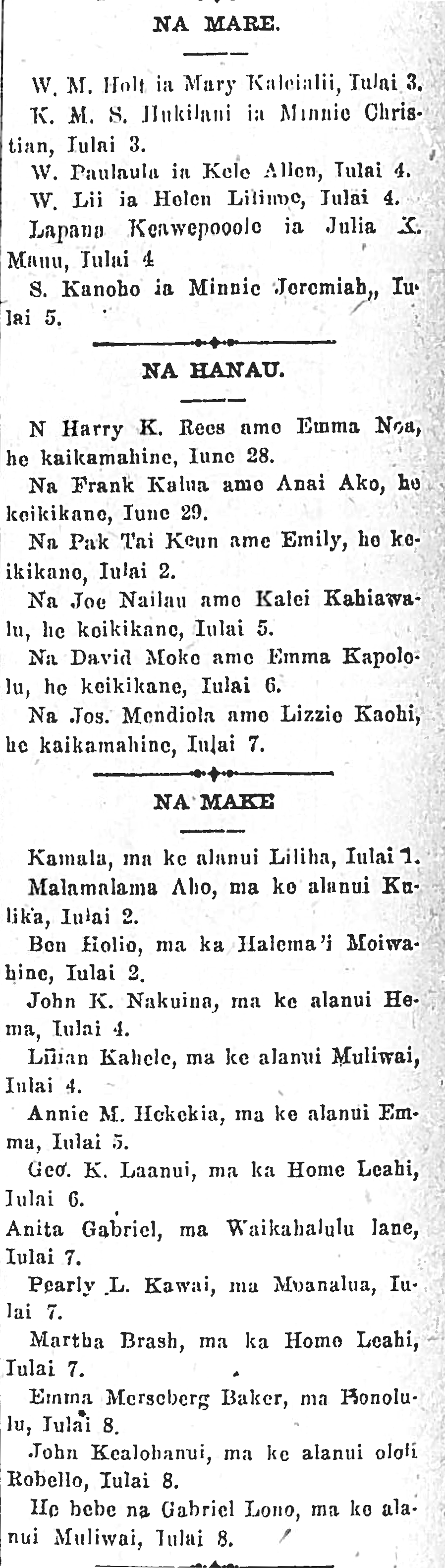 Lapana Keawepooole to Julia K. Mauu, July 4.