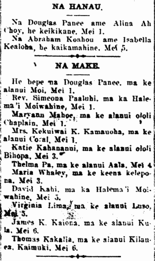 To Abraham Koahou and Isabella Kealoha, a daughter, May 5.