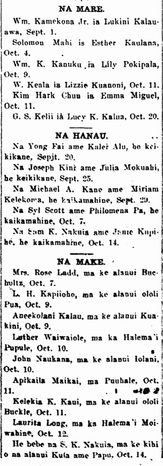To Sam K. Nakuia and Janie Kupihe [? Kapihe ?], a daughter, Oct. 14.