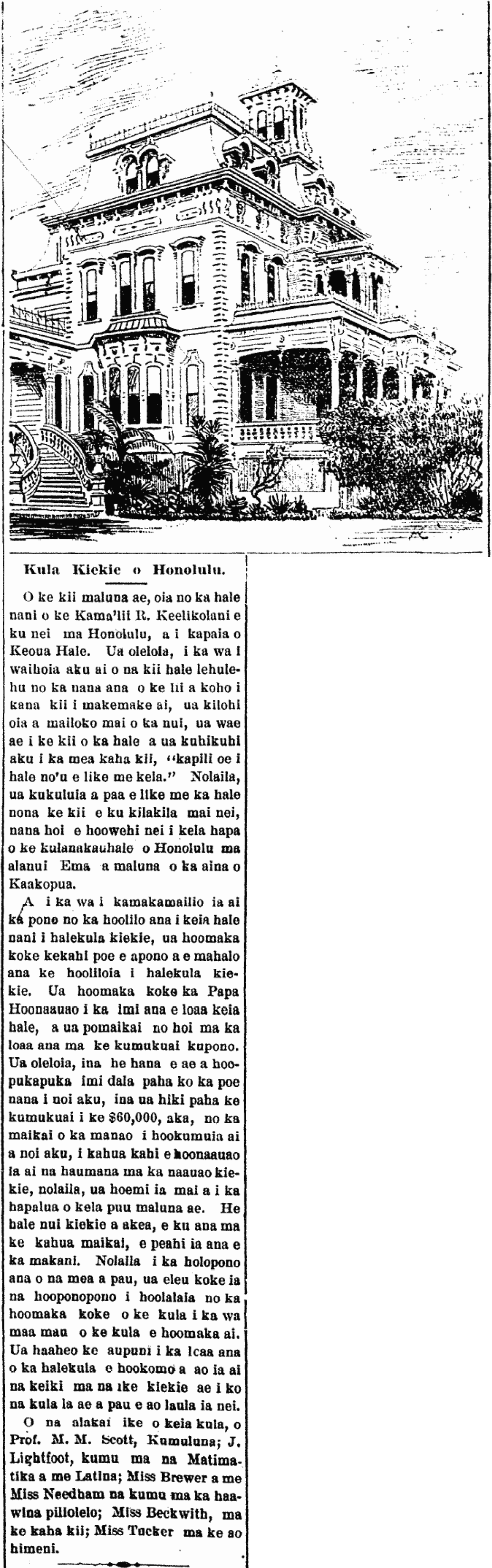 The illustration above is of the beautiful house of Princess R. Keelikolani, standing in Honolulu, and called Keoua Hale. It is said that when many drawings of houses were placed before the alii for her to choose from, she looked through the many and chose the drawing of this house and instructed the artist, “build me a house like that.” Therefore, a house like the one in the picture was constructed to completion which now stands proudly, the building which graces that portion of Honolulu on Emma Street on the land of Kaakopua.