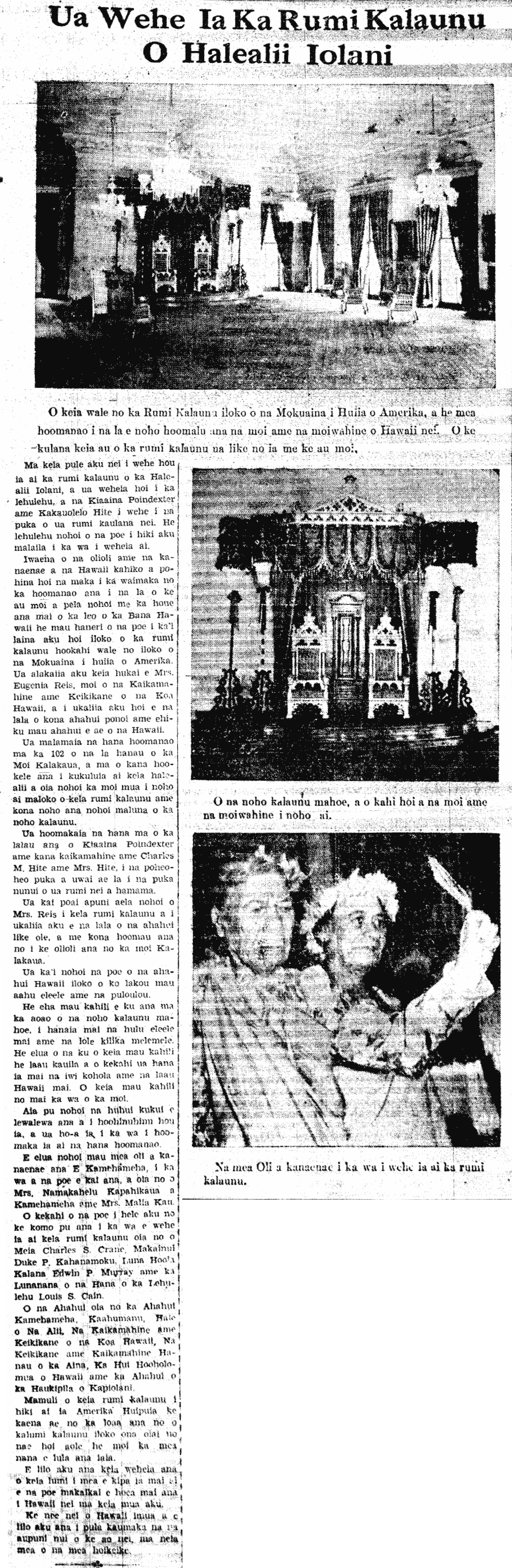 Amongst the chants [na olioli ame na kanaenae] of the ancient Hawaiians, there were eyes misted with tears with memories of the days of the monarchy, and there was also the sweet sound of the Royal Hawaiian Band [Bana Hawaii]; there were hundreds of people lined up in the only crown room in all the United States. This tour was led by Mrs. Eugenia Reis, moi of the Daughters and Sons of Hawaiian Warriors, and in attendance were the members of her association and seven other Hawaiian associations.