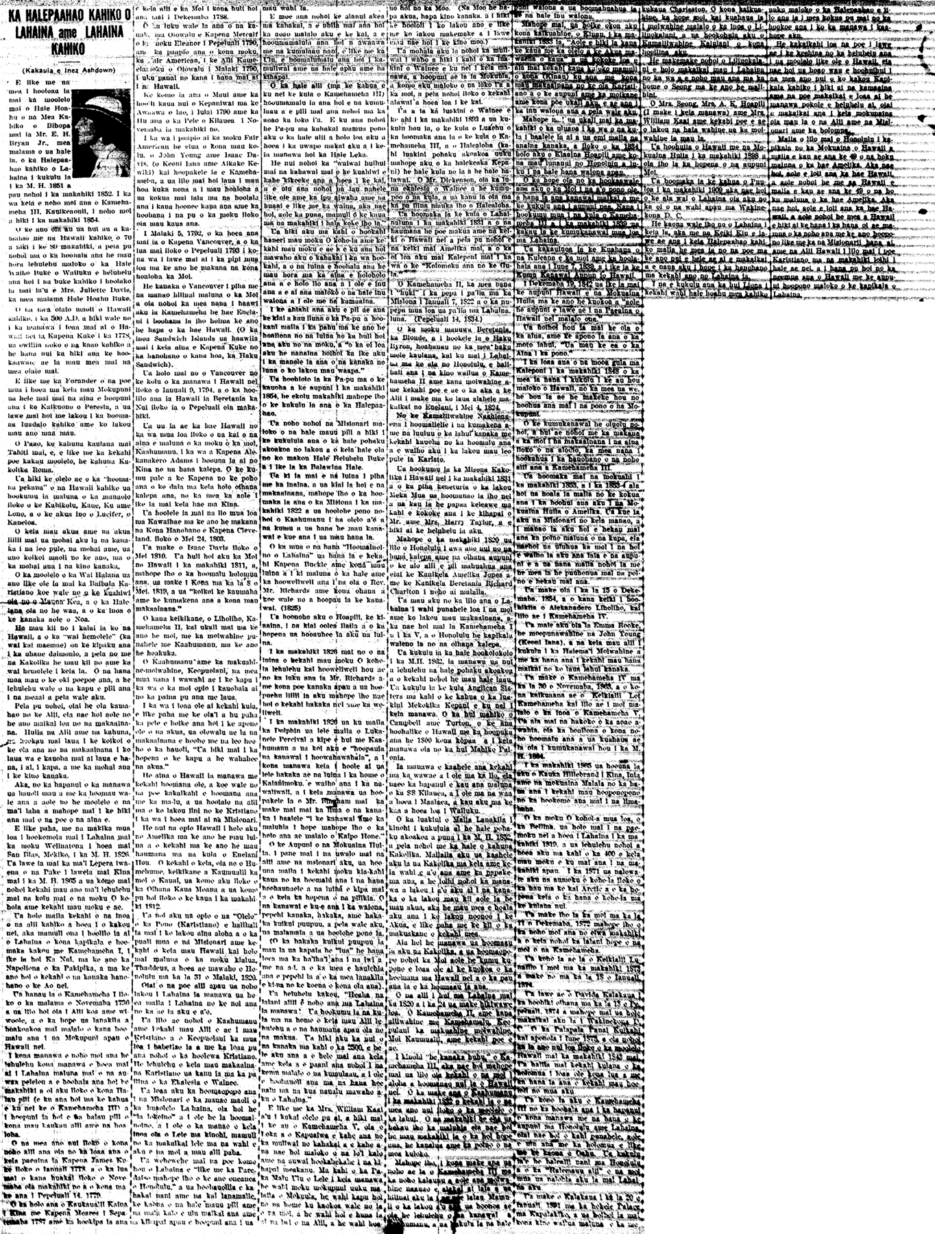 Ua holo maila kekahi o na inoa o na alii kahiko a hoea i o kakou nei, aka mamuli ona i hoolilo ia ai o Lahaina o kona kapikala e hoomaka kakou me Kamehameha I, i ike ia hoi Ka Nui, ma ke ano ka Napoliona o ka Pakipika, a ma ke ano hoi o kekahi o na kanaka hanohano o ke Ao nei.