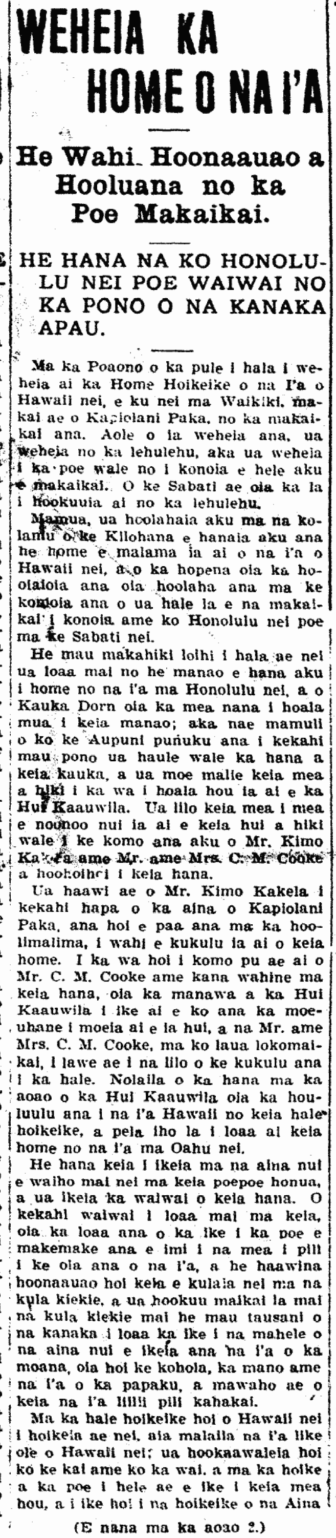 Many years ago, there was a thought to build an aquarium in Honolulu nei, and Dr. Dorn was the one to come up with the idea; however, because the Government held back some of the resources, this idea by the doctor was dropped and it slept quietly until it was revived by the Rapid Transit Company [Hui Kaauwila]. This idea was considered seriously by this group, when Mr. James Castle [Kimo Kakela] and Mr. and Mrs. C. M. Cooke stepped in and encouraged the effort.