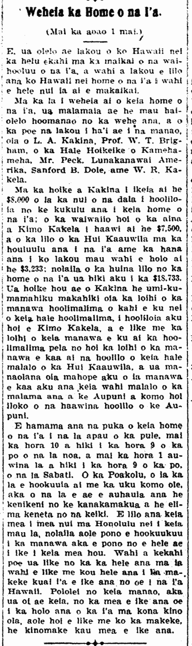Earlier, it was reported in the columns of the Kilohana¹ that a home will be built where Hawaii’s fishes will be kept, and in the end, the report has come true as the building was entered by the invited guests and will be entered by Honolulu’s people on Sunday.