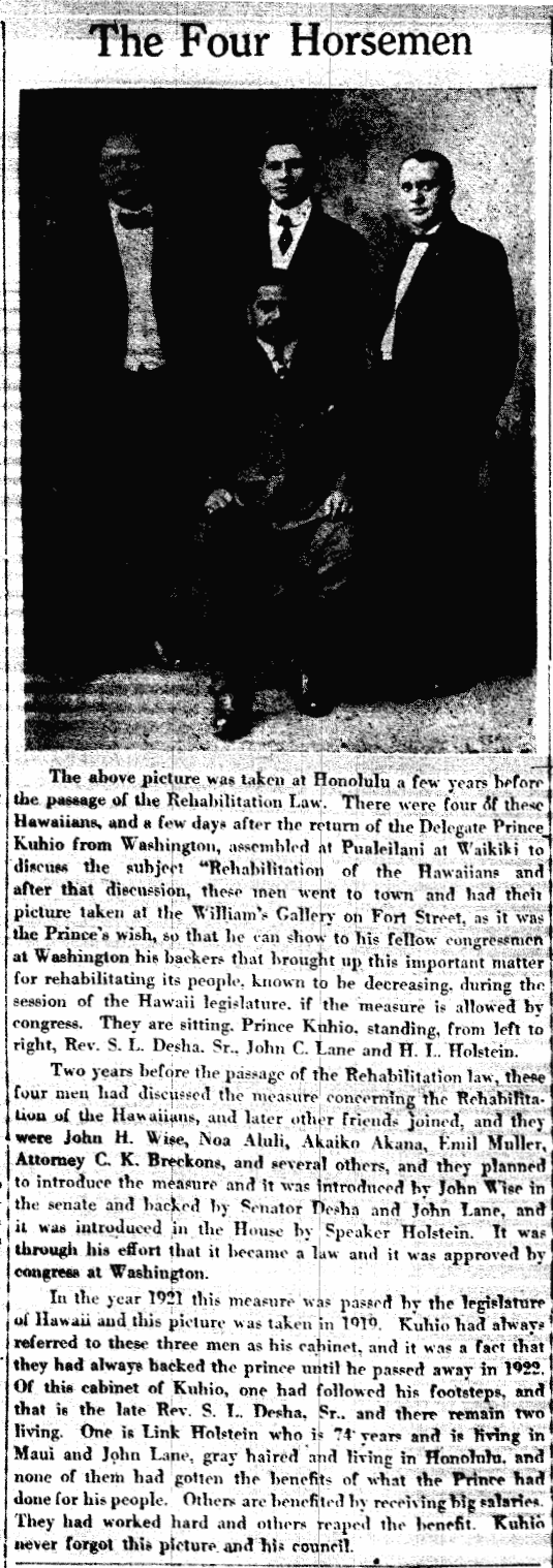 The above picture was taken at Honolulu a few years before the passage of the Rehabilitation Law. There were four of these Hawaiians, and a few days after the return of the Delegate Prince Kuhio from Washington, assembled at Pualeilani at Waikiki to discuss the subject “Rehabilitation of the Hawaiians and after that discussion, these men went to town and had their picture taken at the William’s Gallery on Fort Street, as it was the Prince’s wish, so that he can show to his fellow congressmen at Washington his backers that brought up this important matter for rehabilitating its people, known to be decreasing, during the session of the Hawaii legislature, if the measure is allowed by congress. They are sitting. Prince Kuhio, standing, from left to right, Rev. S. L. Desha, Sr., John C. Lane and H. L. Holstein.